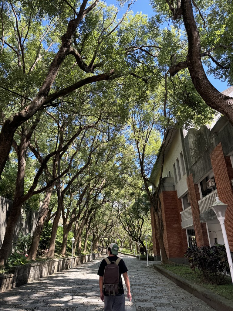我們沿著人行道,走了大約五分鐘後,就遇到了一個分岔路口。這裡也是我們偏離台北大縱走的地方。左側是學園路。我們選擇了走右側的(無名)岔路,蜿蜒穿過國立臺北藝術大學的校園。經過第一棟大學大樓後,我們右轉、左轉,找到了一個行人步道。我們停留許久,欣賞學校磚砌建築風格,還有年代久遠的榕樹。
