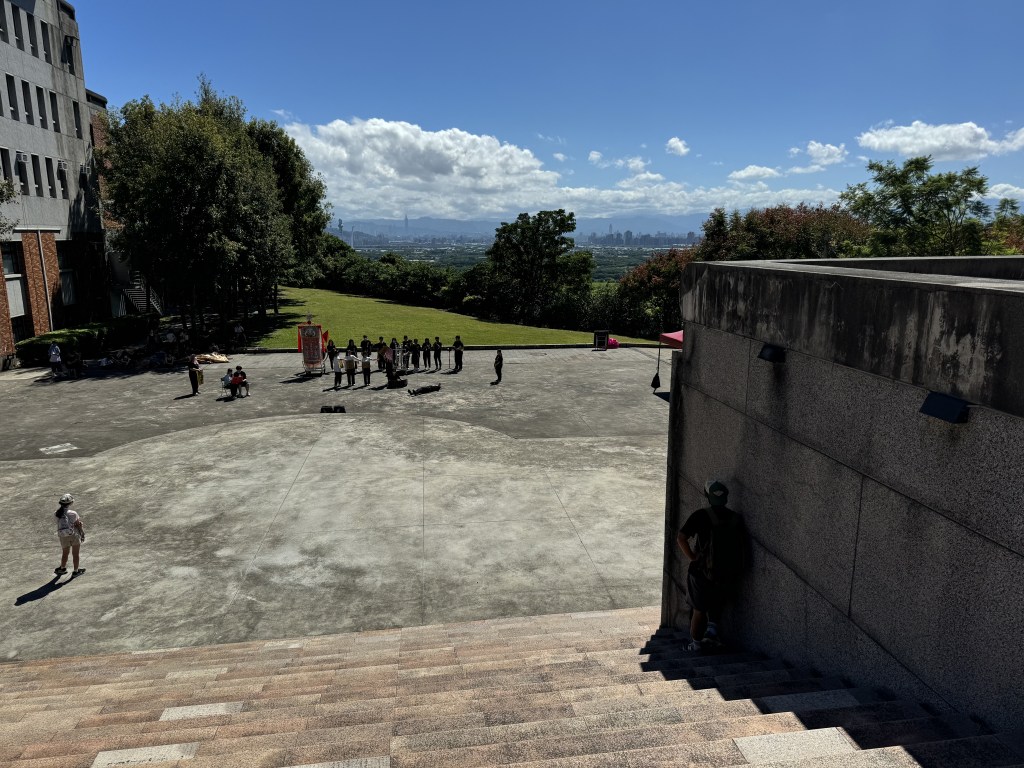 這時候,我們從樹林中走出來了,發現我們來到了一個大廣場。有幾位學生正在排練表演。我們看了一下。後來,我們在左邊找到了一個階梯,爬到馬路邊。那裡有一個平台,可以俯瞰台北盆地。大學和景色都非常值得觀賞,尤其是在這種晴朗的日子裡。