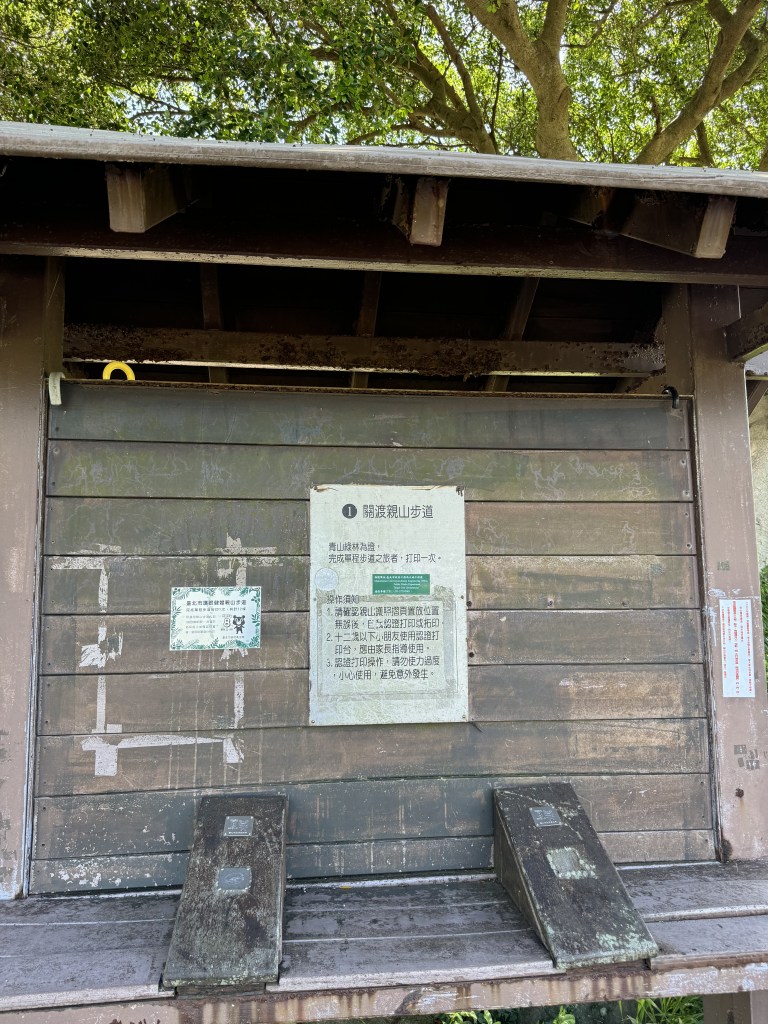 We followed the road to turn past the swimming pool, through the edge of the sculpture park, and then up some swiftly switchbacking turns to a parking lot. We skirted the exit and made it back to the Taipei Grand Trail and Xueyuan Rd. Just a few meters uphill was the beginning of the Mt. Zhongyi trail. This is also the first stencil spot of the Taipei Grand Trail. You can bring along a notebook and trace over the raised images at various stages along the trail as proof that you made it there. My son thought that this was a great idea, kind of like catching Pokemon along the way. We decided we’d bring a notebook along next time.