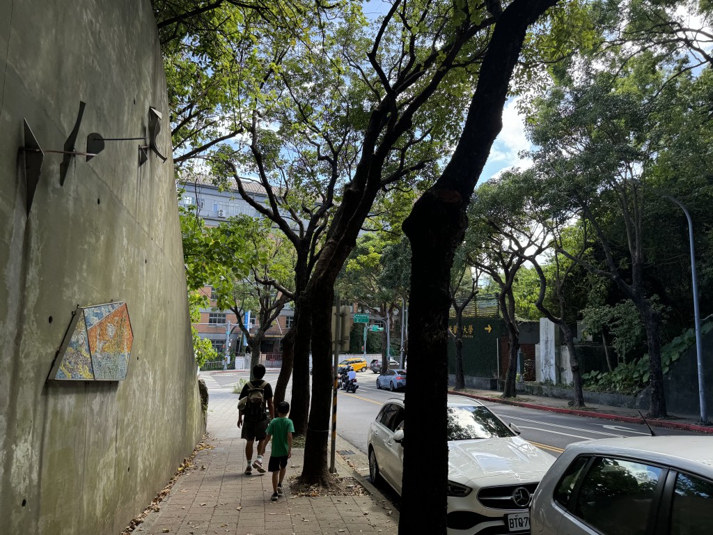 回到那個十月的很炎熱的下午,我們一家三口在學園路的底處開始網上走。這裡是一條被水泥牆和樹木包圍的寬闊道路,很陰涼,很舒服。沿途有馬賽克和其他藝術裝置。往上走幾分鐘有一些支路和小公園。但因為這些地方容易遇到怪人,我建議帶著孩子走的山友還是走主要道路。