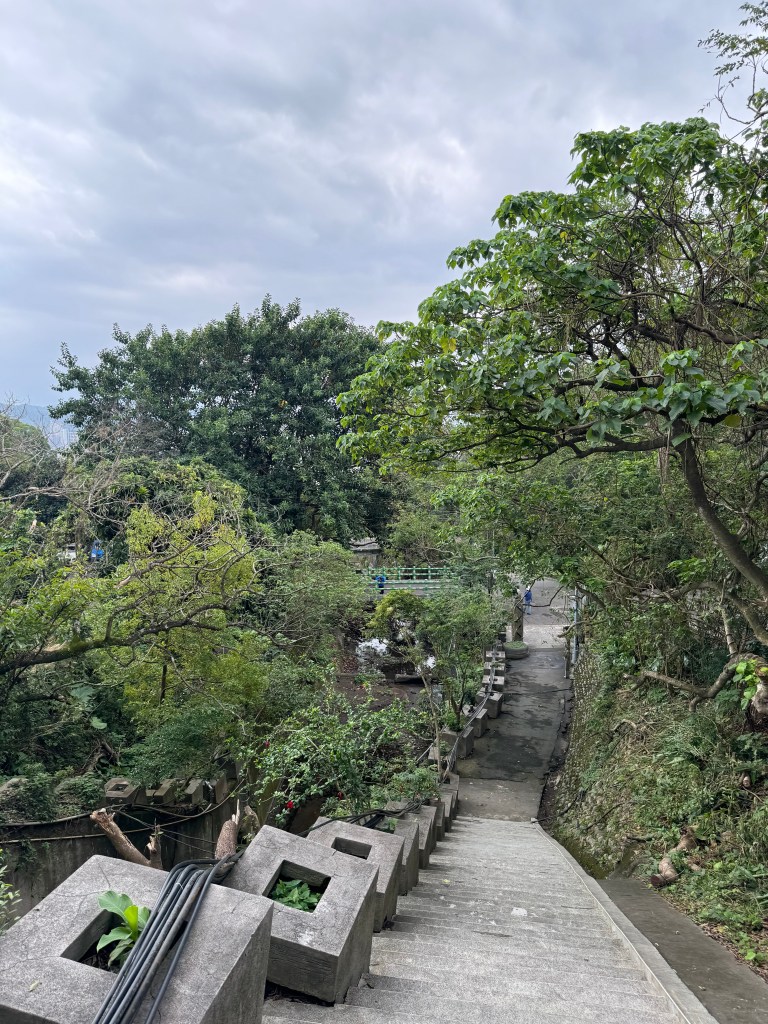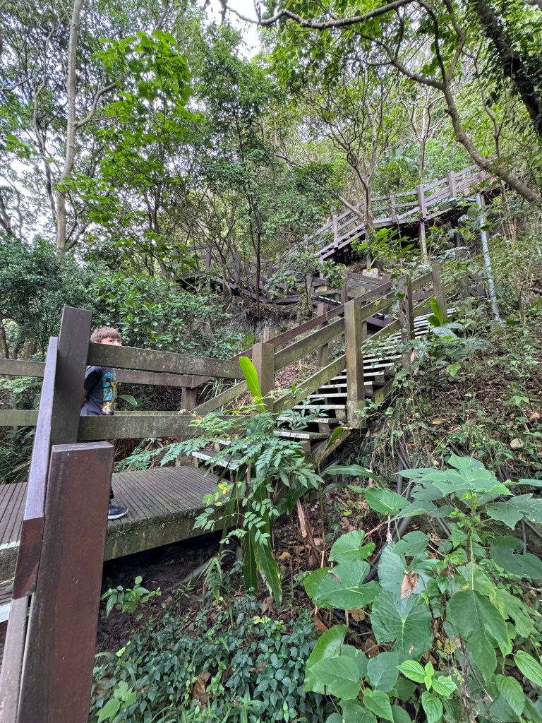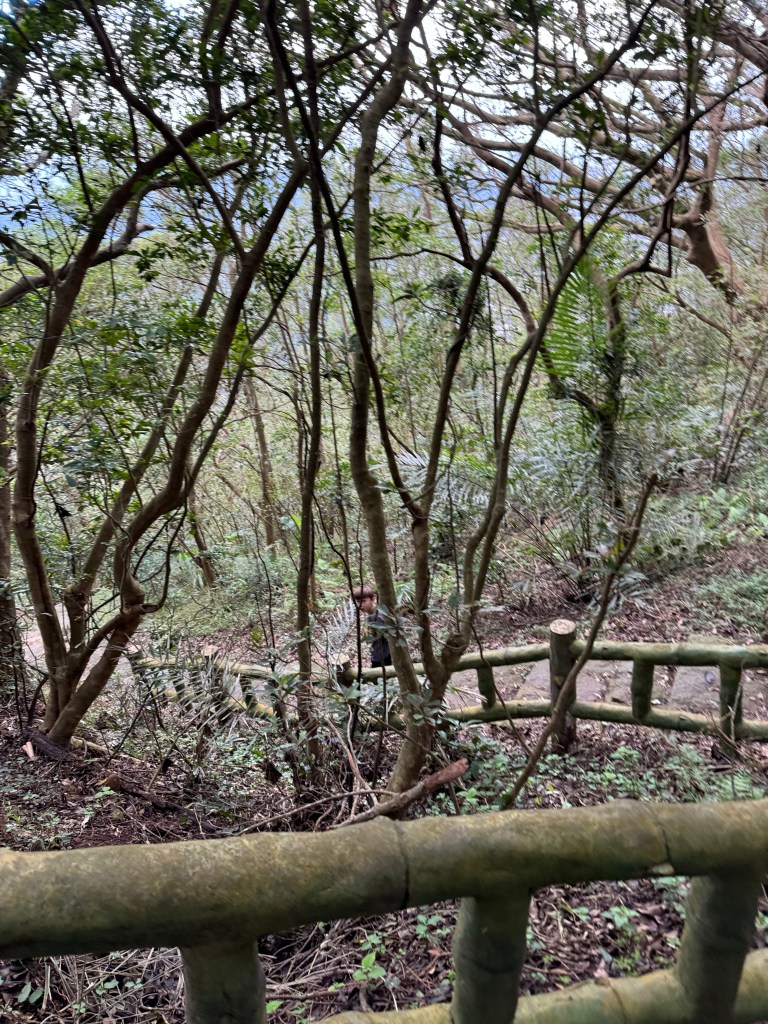 After some switch-backing, the trail started to go down steeply (this would be a steep upward climb for Taipei Grand Trail thru-hikers; we were glad we went the other way!!). Down and down and down we went.