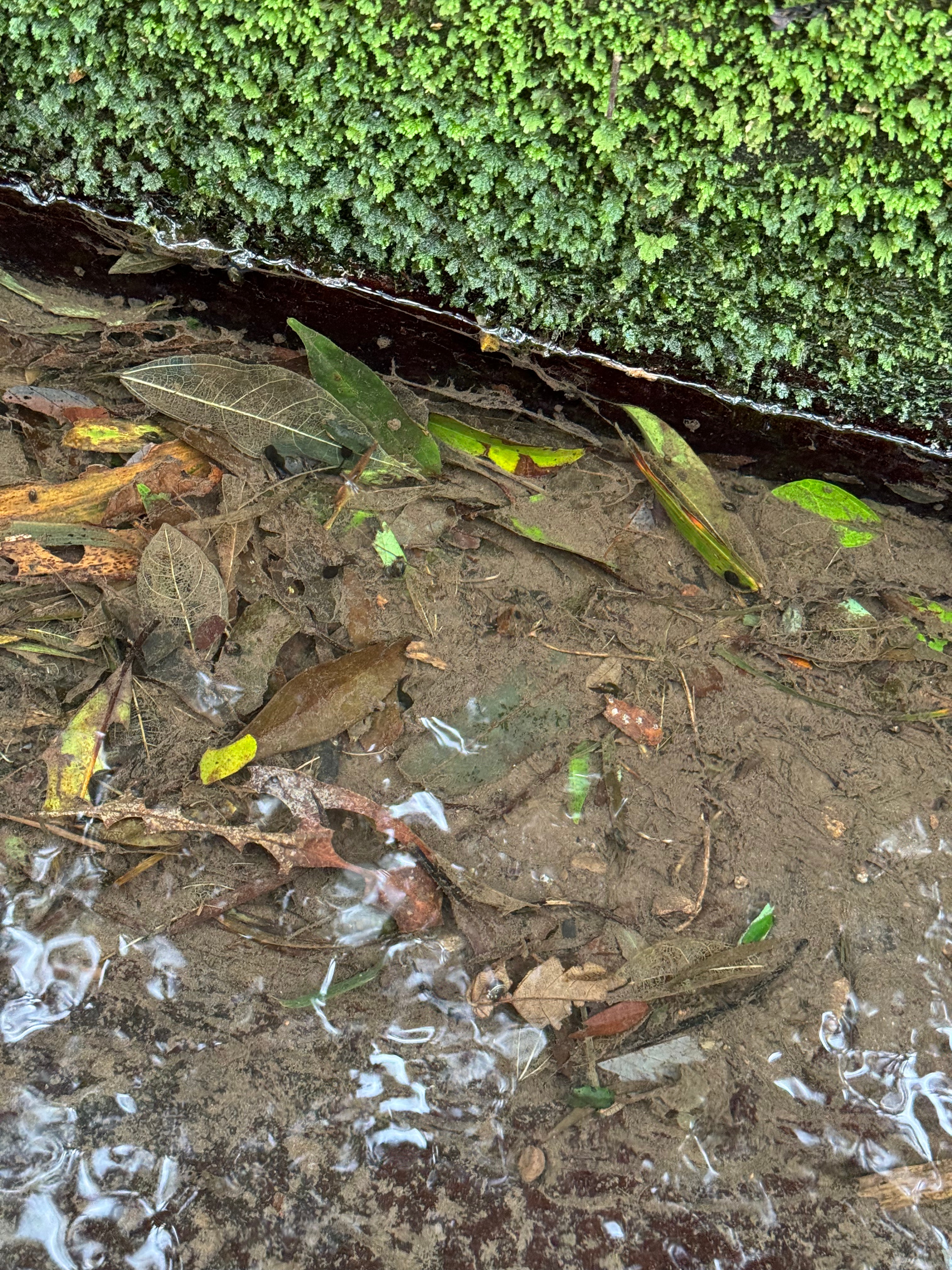 The loop trail is flat at this point and hugs the side of the mountain for quite some distance. It is lined by a small ditch in which leaves and water bugs proliferate. My six-year-old liked this part, lots to poke at with sticks and jump over.