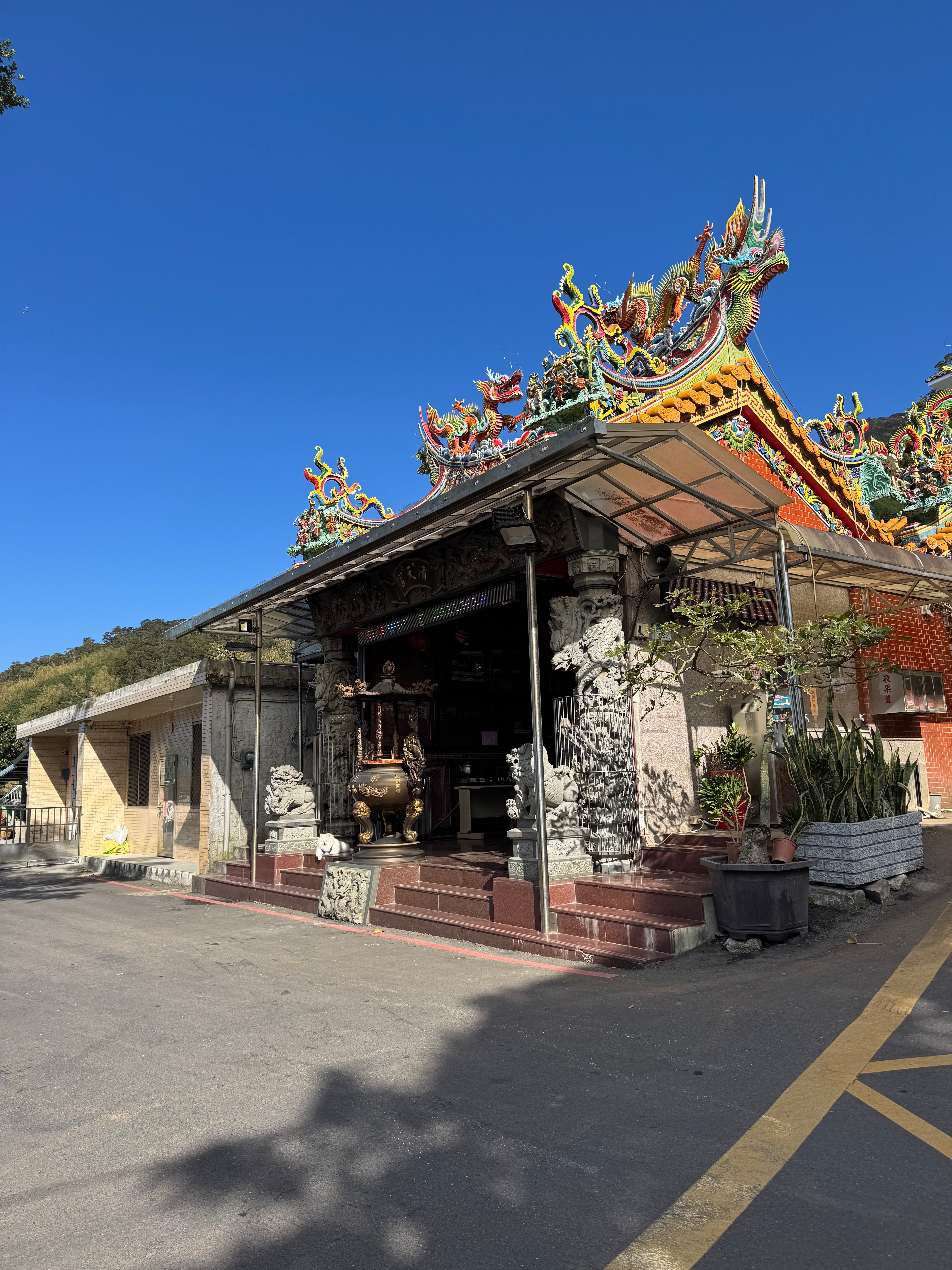 The temple is dedicated to Mazu 馬祖, the sea goddess. On a clear day you can see all the way from Taipei 101 on one side to the ocean on the other. There is also a wizened banyan tree across the street from the temple. Qingtian Temple is a gathering point for hikers, a good access point to the many peaks of Mt. Datun above.