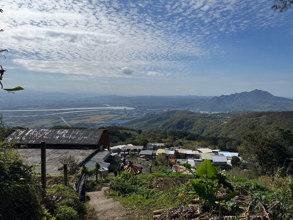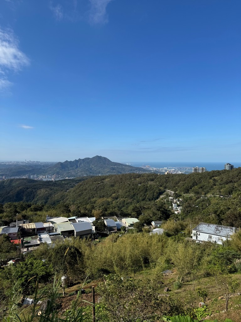 The hike begins with a stone staircase (as is so often the case) and views of the ocean over terraced farmland. That’s Mt. Guanyin 觀音山 in the distance, her arms stretching out toward the blue yonder, and Linkou behind her.