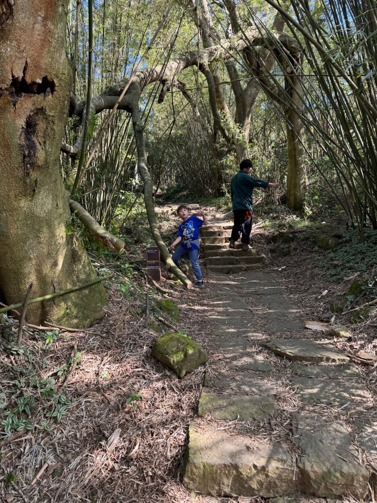 Finally, after walking about a mile and around 50 minutes (yes, there was a lot of complaining on the stairs) we made it to the Miantianshan Pavilion. This is a crossroads of sorts along the Taipei Grand Trail. If you continue going straight along the flattish path, you will eventually reach Erziping Recreation Area, and beyond it, the end of the first section of the Trail and a bus stop. If you turn right, however, you embark on the second section of the TGT. Having never hiked this part of the trail, we were persuaded to turn right at the pavilion by our bilingual kiddo, who saw the rugged terrain and thought it looked cool. And it does! but also scary. We clambered upward for about five minutes before heading back down the mountain, nervous that we would be late for our banquet.