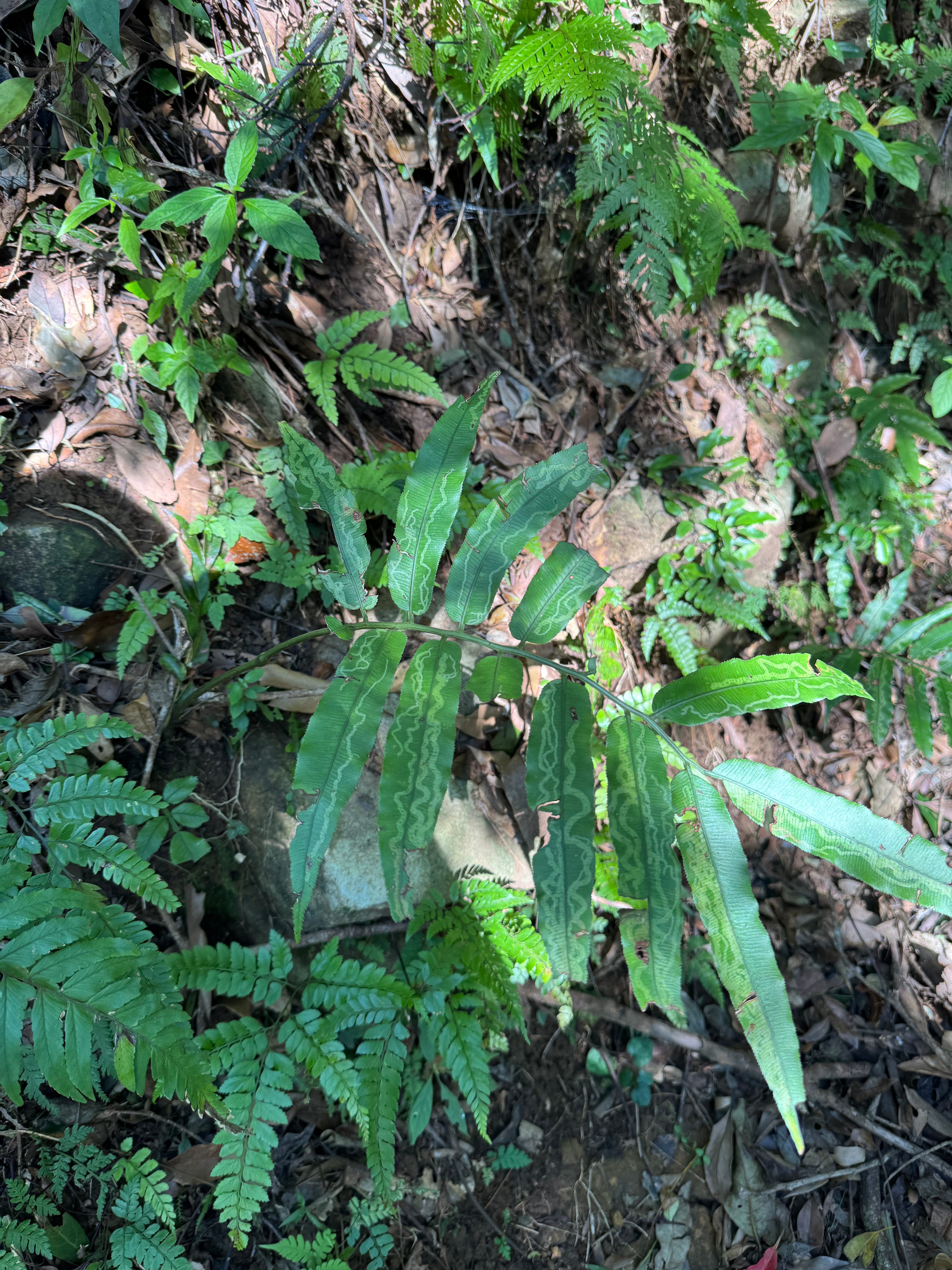 All too soon, the steps resumed, and my bilingual kiddo started lolling again and looking for distractions along the side of the path. For instance, the cool tree that arched over the path in the picture below. Definitely a dinosaur.