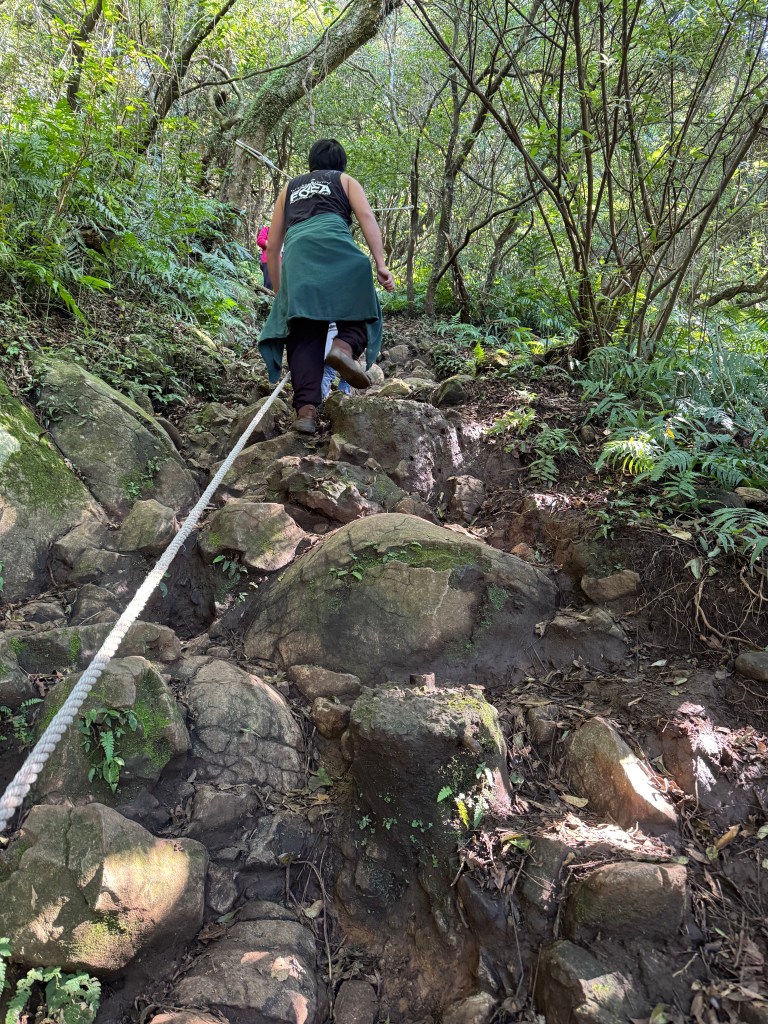 There were even steeper sections (difficult to take a picture that conveys how steep this is). We’ve done steep Taiwan mountain hikes with our six-year-old before (like the Pingxi Crags and the initial ascent of Wuliaojian Trail past Sanxia). All are dangerous if wet and slippery. When hiking with a kiddo on steep sections of a trail only passable by clinging onto a rope, it’s important to be prepared. Gloves are crucial, the right shoes, lots of water, and having two adults along (one on each end) is best.